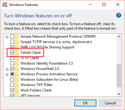 To add this feature, open up your Control Panel and select “Programs and Features”. In Windows 10, click on the Start button then click on the gear icon to get to settings. In the search bar type "turn Windows features on or off". Within the Windows Features dialog, check the box next to "Telnet Client" and click OK to save the change.
